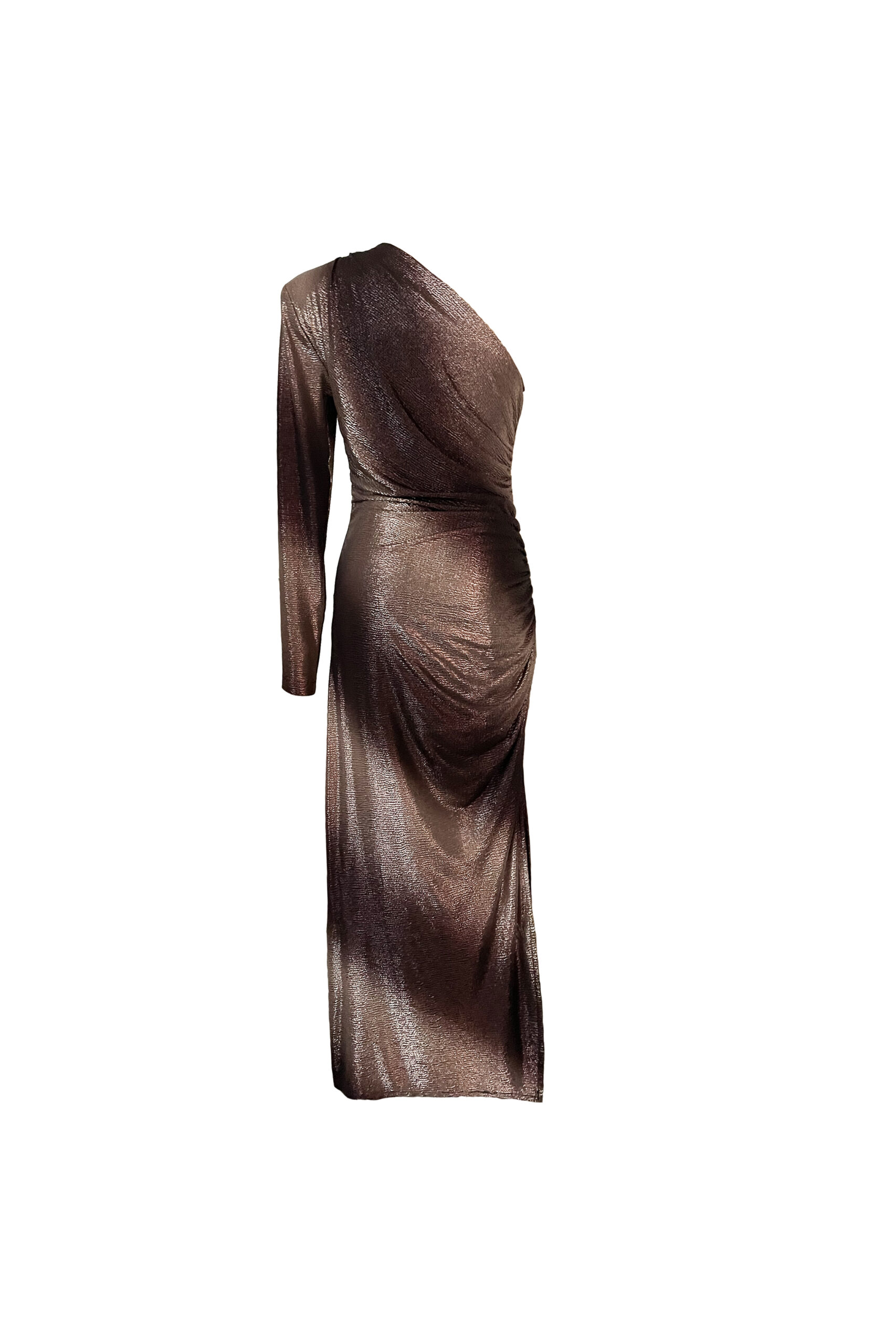 Abito lungo monospalla lamé in jersey con spacco profondo dalla vestibilità aderente. Il tessuto bicolor crea un effetto lucido che varia dalle sfumature del rosa fino alle tonalità del marrone.