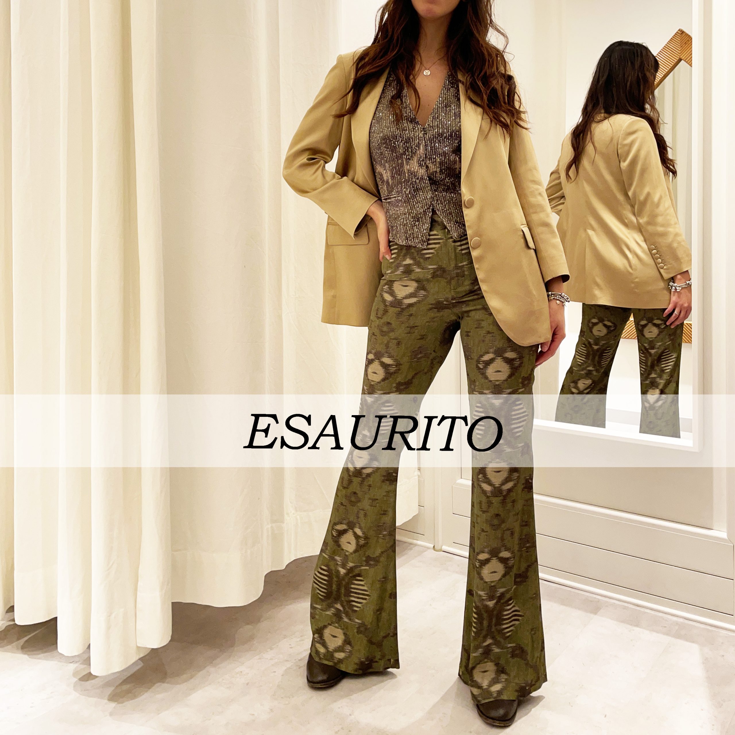 Pantaloni a zampa in fantasia etnica sui toni verdoni dalla vestibilità slim sulla vita alta e ampi in fondo. Ideale da abbinare al suo gilet o alla sua giacca morbida fantasia etnica verdone.