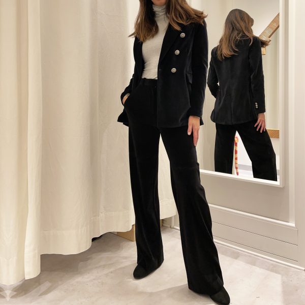 Giacca doppiopetto in velluto liscio color nero con bottoni metallo dalla vestibilità regular. Il modello è pratico e facile da abbinare a qualsiasi look, ma risulta elegante se abbinato ai i suoi pantaloni palazzo velour nero.