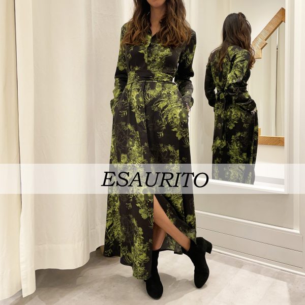 Abito in stile camicione lungo con cintura in vita e abbottonatura lungo tutto il capo. Il tessuto è composto da fondo nero e tante foglie e fiori di un verde acceso. Abito ideale sia di giorno sia di sera.